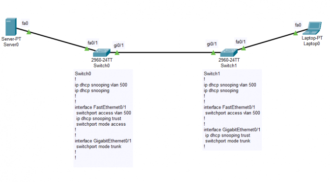 Lets look at this topology. The Server0 is configured with DHCP service and then it is connected to the Switch0 on port Fa0/1. This switch is connected to Switch1 from port Gi0/1 to Gi0/1. The laptop which is a DHCP client is connected to the Switch1 on Fa0/1.